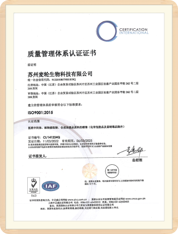 麦轮生物技术已获取由时代国际正确化结构(ISO)的拟定好的品性申请模式正确ISO 9001:2015v认证,在品性相关政策的拟定好、阶段申请、资本公司申请、物质和业务办理履行等工作方面适于点评正确。