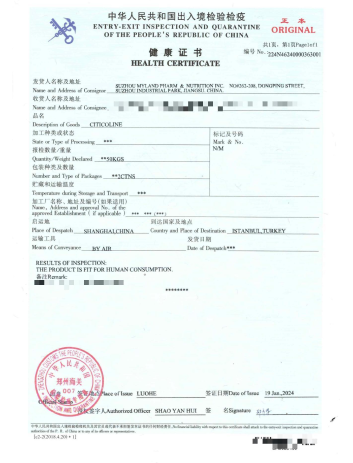 本子公司所出产地的胞磷胆碱经核查,已顺遂授予由我们收入支出表境核查检验检疫结构开立发证的安康证明。