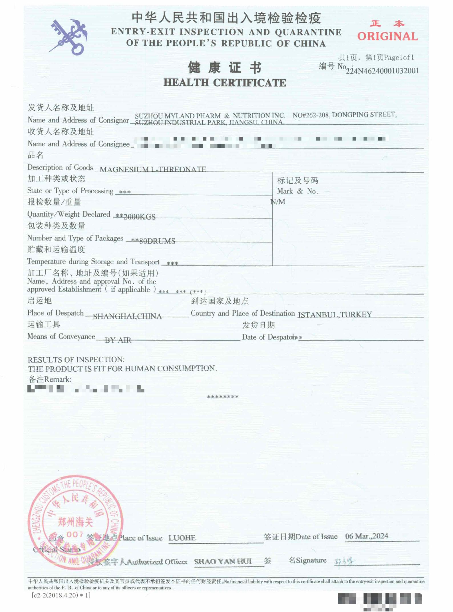本平台所生厂的苏糖酸镁经查检,已顺遂选取由中国人结余境查检检疫证结购开具出具的安康英语证书。